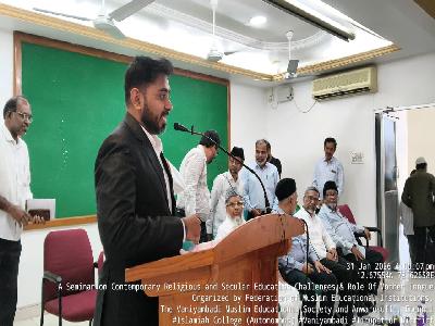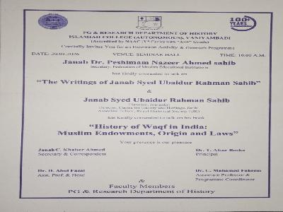 The Muslims of Vaniyambadi established the Vaniyambadi Muslim Educational Society in 1901 with a view to translate the message of Sir Syed Ahmed Khan to provide secular education to the people of Arcot region in general and Muslims in particular. The Society was registered in 1905 under Society Registration Act XXI of 1860 and started Islamiah Elementary School in 1903.The founding fathers of the Society were Janab T.Hajee Badruddin Sahib, Janab Malang Hayath Batcha Sahib, Janab T.Ameenuddin Sahib and Janab Malang Ahmed Batcha Sahib. The full-fledged Islamiah High School came into existence in 1912. In 1916, the Society resolved to establish Islamiah College and the foundation stone of the College was laid by His Excellency Lord Pentland, the then Governer of Madras Presidency.