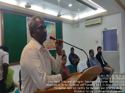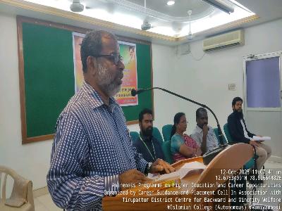 The Career Guidance and Placement Cell in association with Tirupattur district Minority Welfare Association organized a career orientation programme on "Awareness on Higher Education and Career Opportunities" for 10th, +2 and college students On 12th October 2023. The programme started with qirath by Dr. A. Nazim Ahmed, Placement officer followed by Thamizthaivazthu. Mr. Augustin, Hostel warden and minority welfare association in charge, Vaniyambadi offered his welcome address. Dr. T. Afsar Basha, Vice- Principal, delivered his presidential address. In this occasion Dr. Jayaprakash , Assistant Professor, Sacred Heart College (Autonomous), Tirupattur, delivered a talk on opportunities in higher educations and Prof. B. Mohammed Fuzail, Member CG & PC offered his special lecture on avenues available in higher education later Thiru. D. Baskara Pandian IAS, Tirupattur distrct collector graced the occasion and interacted with the students and motivated them to go ahead towards higher studies.