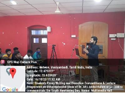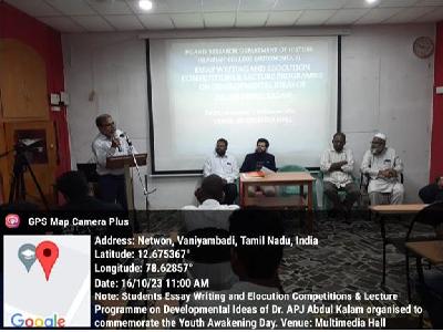 The P G & Research Department of History organised a Students Essay Writing and Elocution Competitions & a Lecture Programme on Developmental ideas of Dr. A.P.J. Abdul Kalam to commemorate the ‘Youth Awakening Day’. The programme started at 10.30 a.m. in the Multimedia Hall with the recitation of Holy Quran and Tamil Thai Vazhtu by students. The programme was compeered by Dr. C. Mohamed Faheem. Mr. D. Abul Fazal, Asst. Professor and HOD of History welcomed the Guest and the participants. Dr. T. Afsar Basha, Vice-Principal in his felicitation address highlighted about the simplicity of former president of India Bharat Ratna Dr.A.P.J. Abdul Kalam.