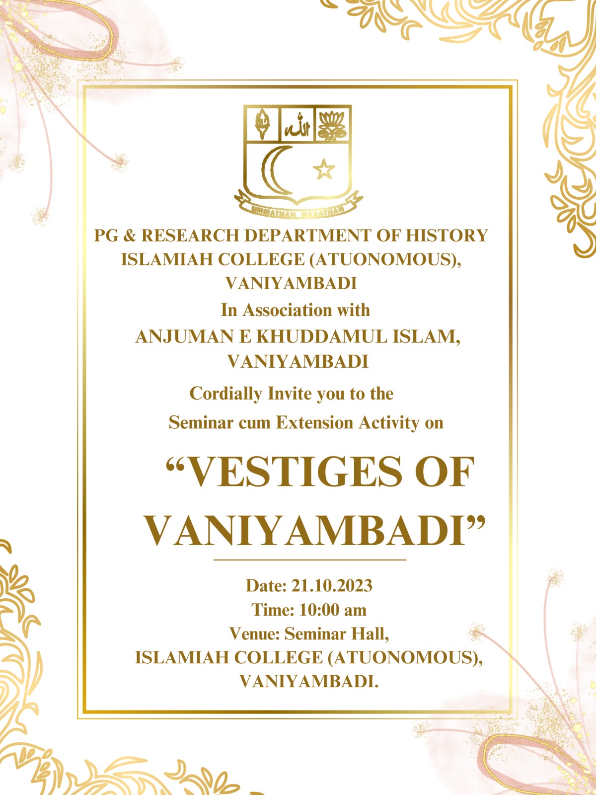 The PG & Research Department of History organised History Association Function on Vestiges of Vaniyambadi in association with Anjuman-e- Khuddamul-ul- Islam, Vaniyambadi at Seminar Hall of our college on 21st October 2023.The programme started at 10.30 a.m. with the recitation of Holy Quran and Tamil Thai Vazthu.
