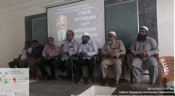 The Post Graduate and Research Department of History, Islamiah College (Autonomous), Vaniyambadi organised a seminar programme for History students on 30th October 2023 to commemorate the centenary celebration of Vaikom Satyagraha. In this seminar organised for History students the Head of the Department Mr. D. Abul Fazal gave a brief introduction on the life and impact of Periyar. Dr. K. Murugan gave a detailed account of the circumstances leading to Vaikom Satyagraha and the consequence of the satyagraha. All the members of the staff and students participated in the programme. The programme finally closed with students speaking on Periyar E. V. Ramaswamy Naicker.