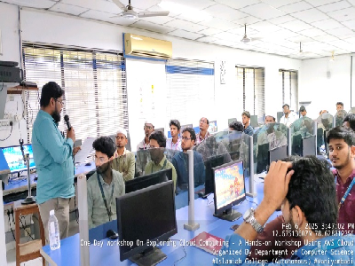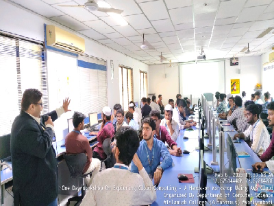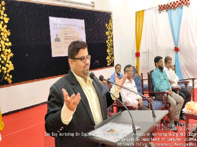 The Department of Computer Science, Islamiah College(Autonomous), Vaniyambadi, organized One Day workshop on “Exploring Cloud Computing – A Hands-on Workshop using AWS Cloud” on 06-02-2025. The objective of this workshop is to create awareness about AWS to the students and to update their knowledge. The workshop began at 10 am with Qirath followed by Tamil Thai Vazhthu. Mr. A. A. Khader Maideen, Head of the Department welcomed the gathering. Dr. T. Afsar Basha, Principal delivered Presidential Address and Vice Principals Dr. Tahir Hussainy (Administration) & Dr. S. Shaikh Khader Nawaz (Academic) delivered Key Note Address. Dr. Salman Ayaz. A, Asst. Professor of Computer Science introduced the resource person Mr. Afzal Bijli FHM, Assistant Professor, MEASI Institute of Information Technology, Chennai. The work shop was conducted in two sessions. It was attended by 120 student participants.