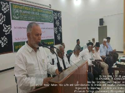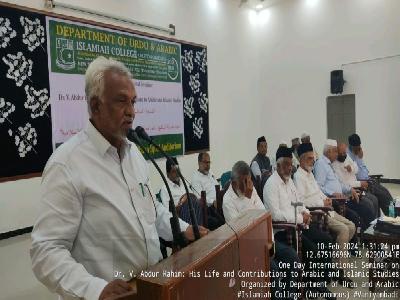 Department of Urdu and Arabic of Islamiah College(Autonomous) Vaniyambadi organized a One Day International Seminar in Arabic on "Dr.V.Abdur Rahim Sahib:His Life and Contributions to Arabic and Islamic Studies " on 10.02.2024. Janab A.Mohammed Ashraf Sahib,Chairman MEASI, Urdu Academy Chennai was the Chief guest for this event. In this seminar several scholars from different colleges and universities presented papers highlighting the life and contributions of Dr.Abdur Rahim Sahib.